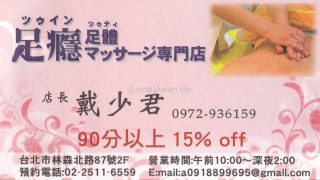 台湾台湾 台北/タイペイ ツゥインマッサージで健全マッサージ施術 ホテルに戻った際に、台北の街をフラフラ歩いていた際に貰ったマッサージのチラシを発見。流石林森北路付近。めちゃめちゃ日本語ですね汗 まぁ、海外で働いてると実感するんですが、日本人・日本企業って「決断まではめちゃめちゃ遅い」「細かい」「フォロー...台湾