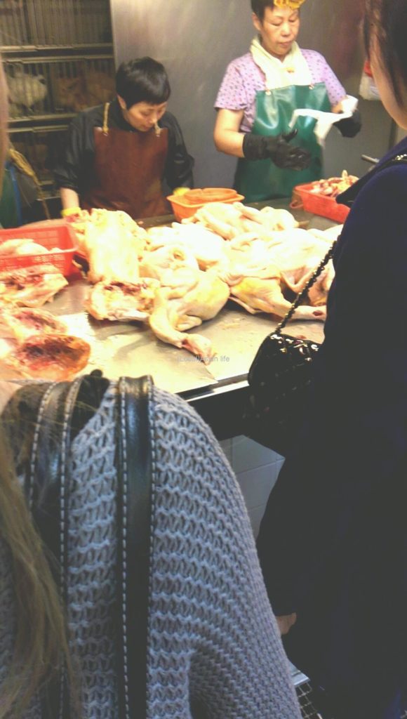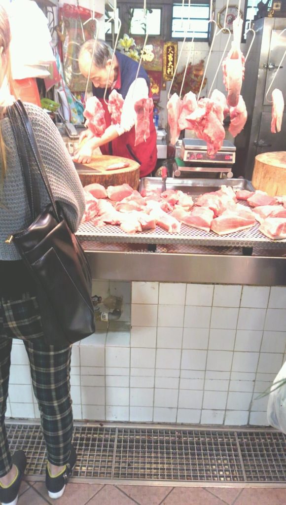 一方、商品の陳列、購入等は完全にアジア式。広東語はさっぱりわかりませんが、彼女さんが「これ、これだけお願い」的なことを言うと、目の前でサクサク切ってビニール袋に入れて渡してくれます。なお、手前のグレーの服が彼女さん。