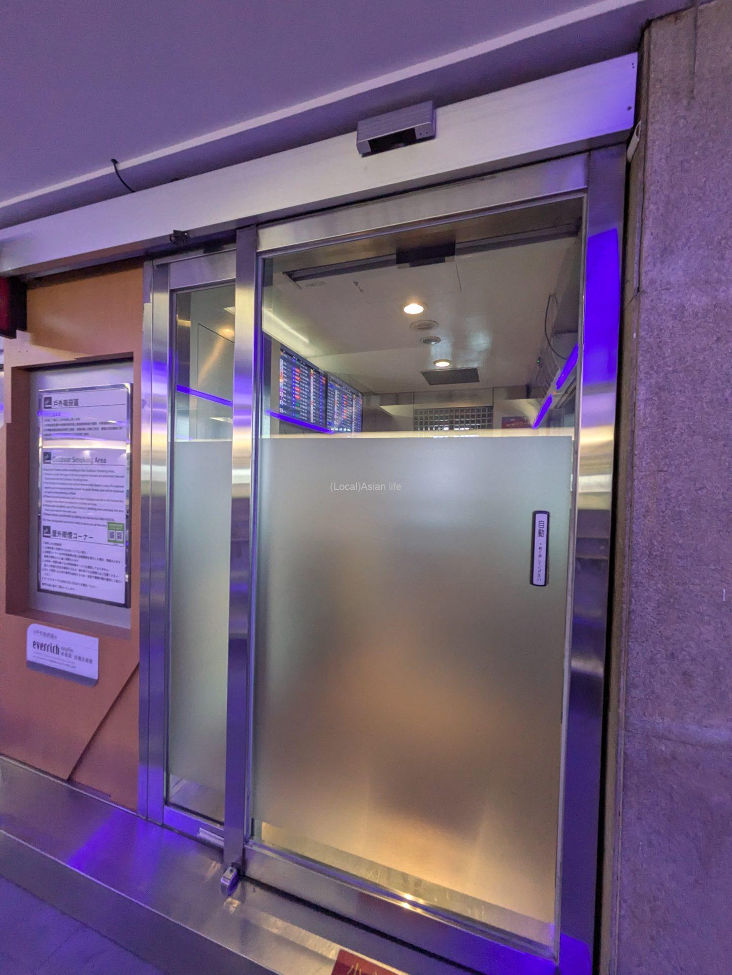 丁度動く歩道が終わる直前ぐらいに、向かって右側に喫煙室発見。こんな感じのドア二重構造ですが、もう匂いで近くに喫煙室があることが直ぐにわかると思います。後ほど出てきますが、半屋外構造の喫煙所ですからめちゃめちゃ中に匂いが入ってきますから。